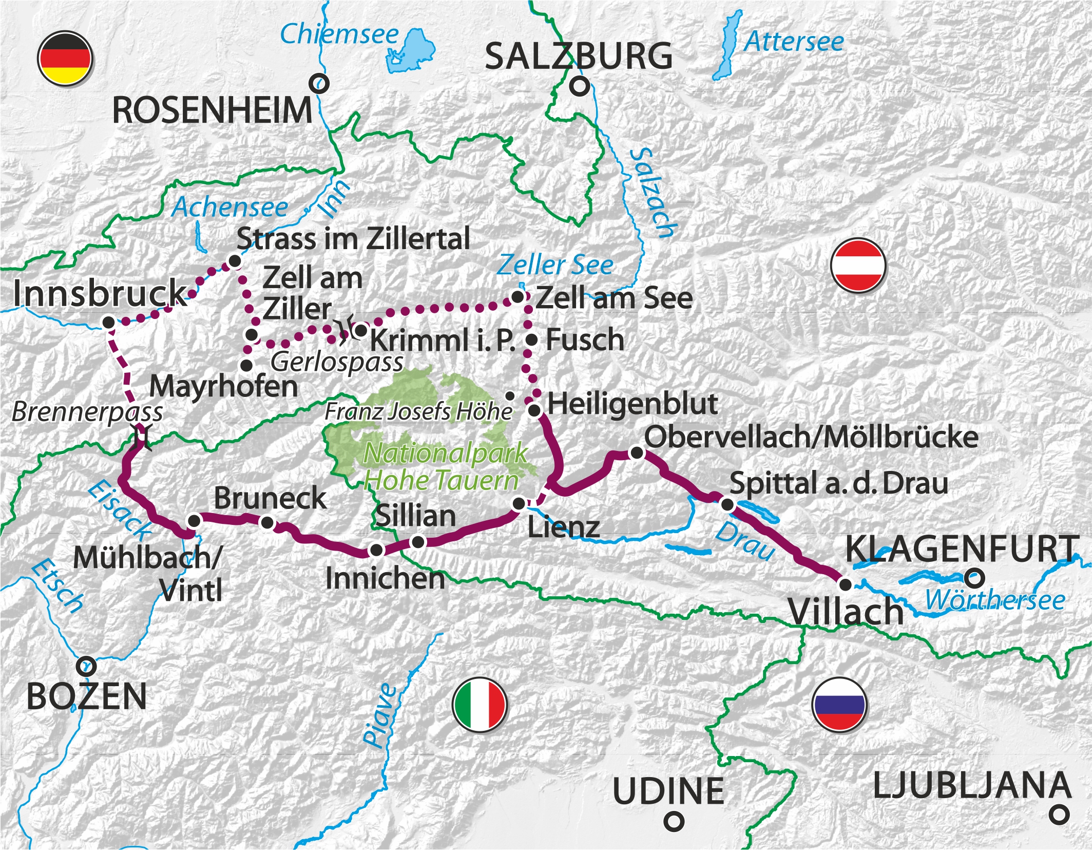 Der “Radweg-Sinfonie Tauernblick” ist eine spezielle Radreise-Variante, die über den klassischen Tauernradweg hinausgeht, die oft als geführte Tour von Innsbruck durch das Salzburger Land oder Südtirol nach Villach führt.